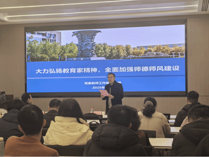 报告中,林楠从“师德内涵的时代要求”“师德失范的警示案例”“师德养成的实践路径”以及“学校相关师德师风制度规定”四个方面系统阐述了新时代师德建设的核心要义,强调教师应努力成为学术前沿的引路人与科学精神的践行者,切实承担起立德树人的根本职责。林楠指出,加强师德师风建设直接关系到“为党育人、为国育才”使命的落实,广大教师须深刻认识其重要意义,自觉以教育家精神引领职业发展,实现从知识传授者到人生引路人的角色升华。此外,他还结合全国教育大会精神、高校教师职业行为准则及学校“一十百千”发展目标,鼓励教师以培养能够担当民族复兴大任的领军人才为崇高责任。
