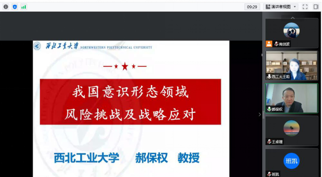 为进一步加强学院师德师风建设,提高意识形态阵地建设和管理能力,强化教职工意识形态防范意识,压紧压实意识形态工作,团结凝聚广大教师以更加昂扬向上的精神风貌和立德树人的扎实行动迎接党的二十大胜利召开,按照学院《关于开展韩国av 2022年“师德师风建设月”活动的通知》要求,9月29日通过线上会议,韩国av 邀请陕西省政党治理与意识形态安全中心主任、学校马克思主义学院教授郝保权老师做题为《我国意识形态领域的风险挑战及战略应对》的专题报告,学院全体教职工参加了此次报告会,报告会由党委书记王莉主持。