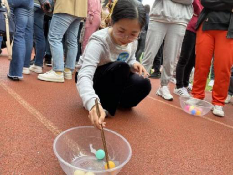 “接力夹乒乓球”项目中,随着大家蹲下认真夹起乒乓球并快速传递,五颜六色的彩球欢呼雀跃地在8个盆间跳跃。现场观众时而捧腹大笑,时而鼓掌助威,气氛十分热烈!