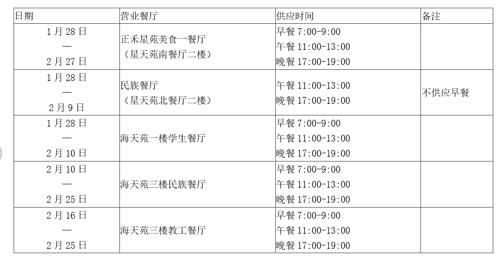 友谊校区学生一餐厅、美食广场、风味小吃城、教工餐厅和民族餐厅2月26日午餐起正常供应;幸福小厨及公诚快餐(含饼屋)2月27日午餐起正常供应。