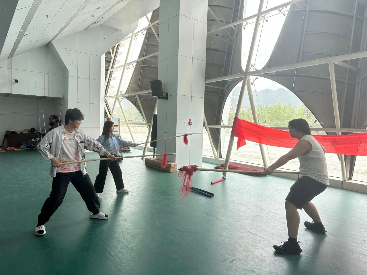体验过扎枪,“锋芒炼”——短兵教学与实践环节自然必不可少。在工作人员的指导下,同学们深入学习劈、砍、斩、刺这些武术动作,在场地中挥举自如,其中的一招一式尽显武林风采。