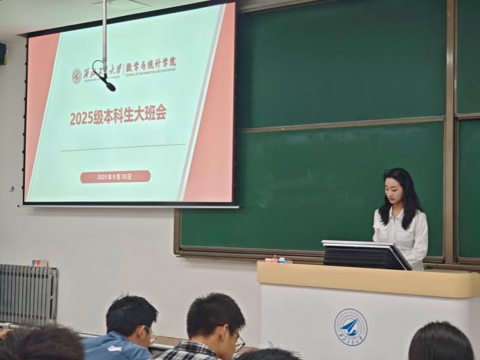 张倩以《学生手册》为依据,采取“条款+案例”相结合的方式逐项解读重点内容。她围绕请销假制度、课堂纪律、奖惩细则与日常行为规范等关键模块,引导新生牢固树立规则意识,严格遵守校纪校规,号召大家共同营造和谐稳定的校园环境与良好学风。