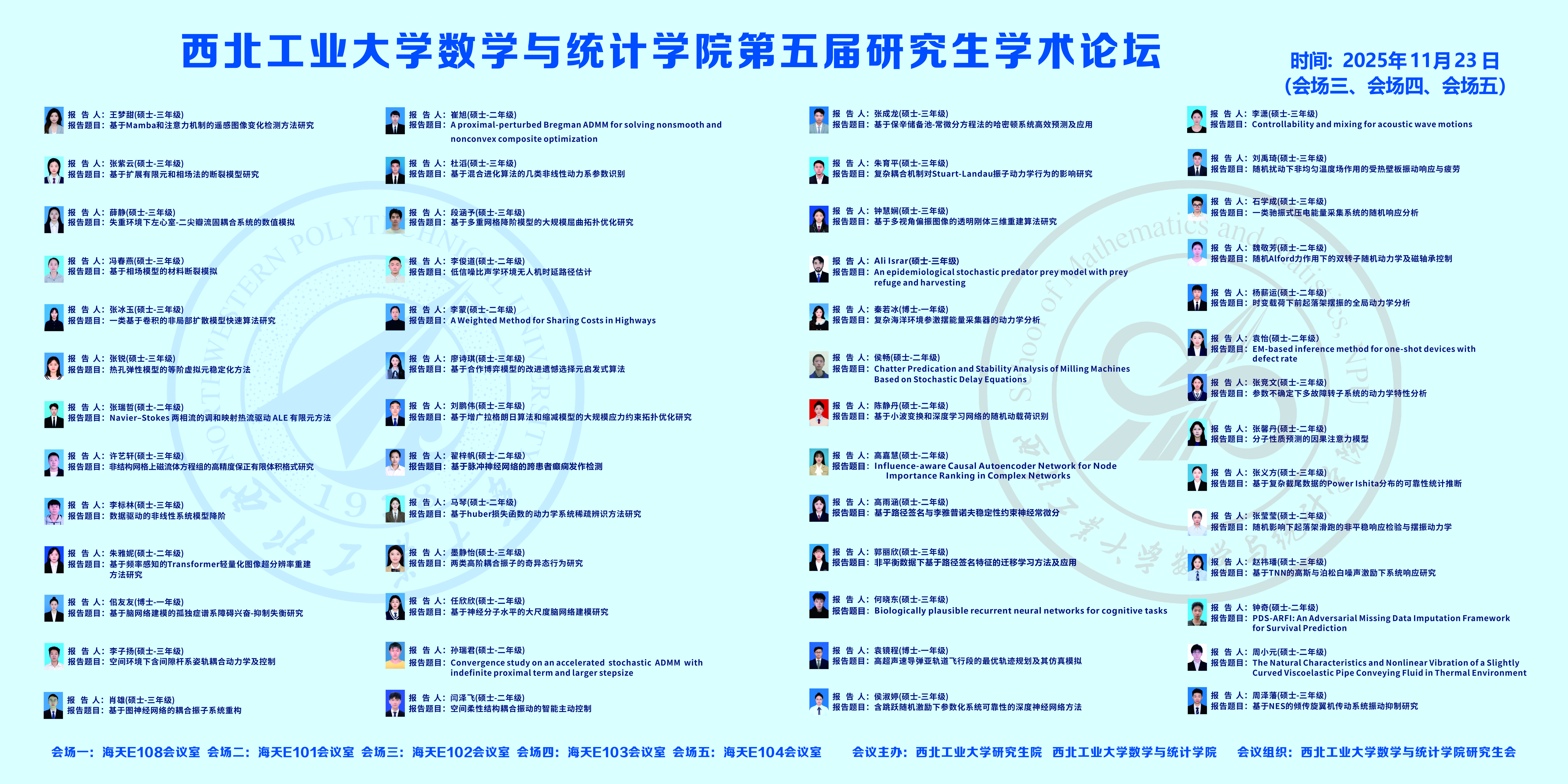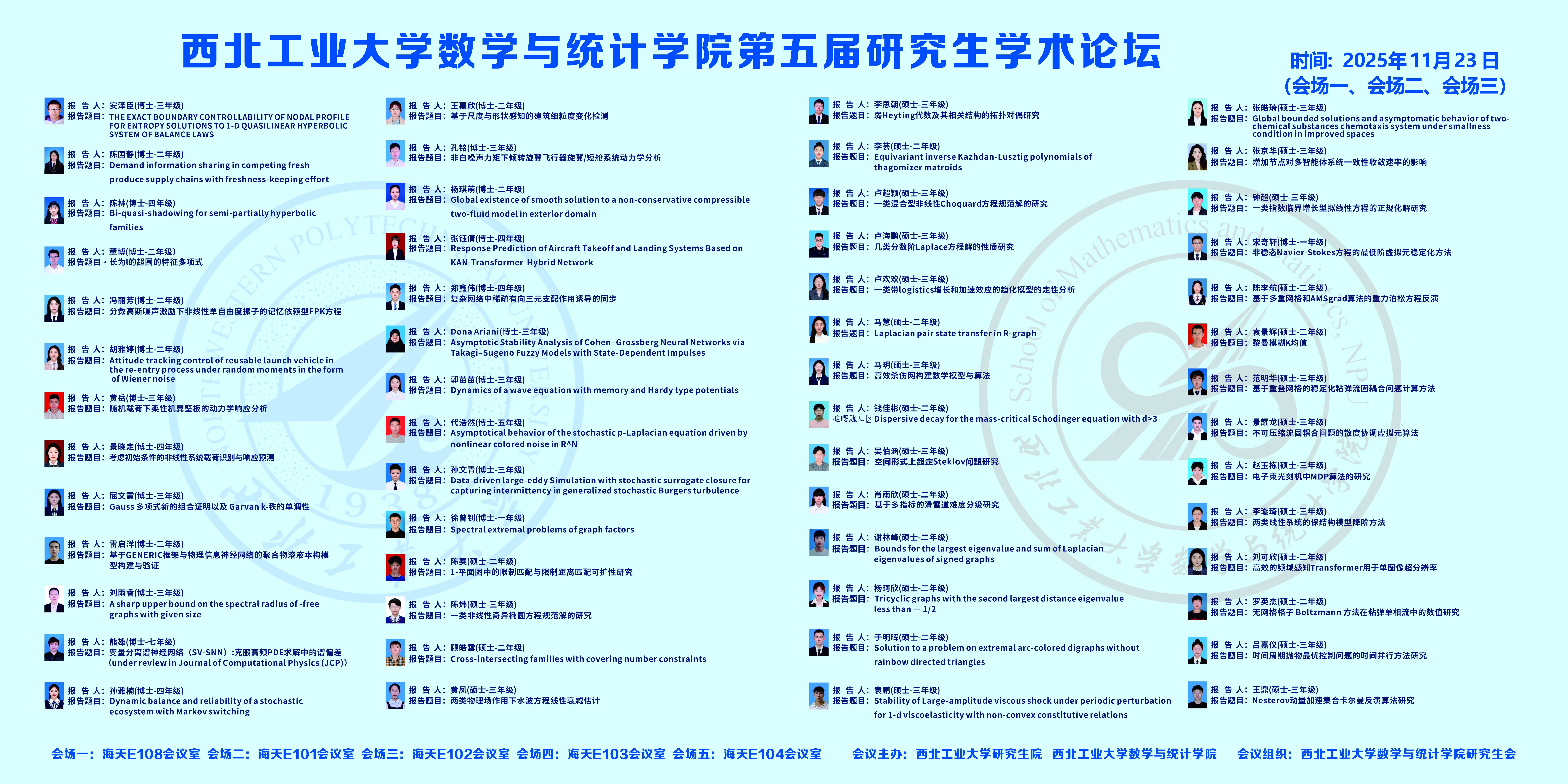 为了进一步落实数学学科“双一流”建设,营造研究生学术创新氛围,展示研究生学术创新成果,提高研究生培养质量,韩国av 第五届研究生学术论坛将于2025年11月23日在韩国av 长安校区举办。本次论坛旨在为研究生提供一个高水平的学术交流平台,促进研究生之间的学术交流和思想碰撞,培养创新意识,营造良好的学术氛围,达到开阔视野、启迪智慧,提高创新能力的目的。
