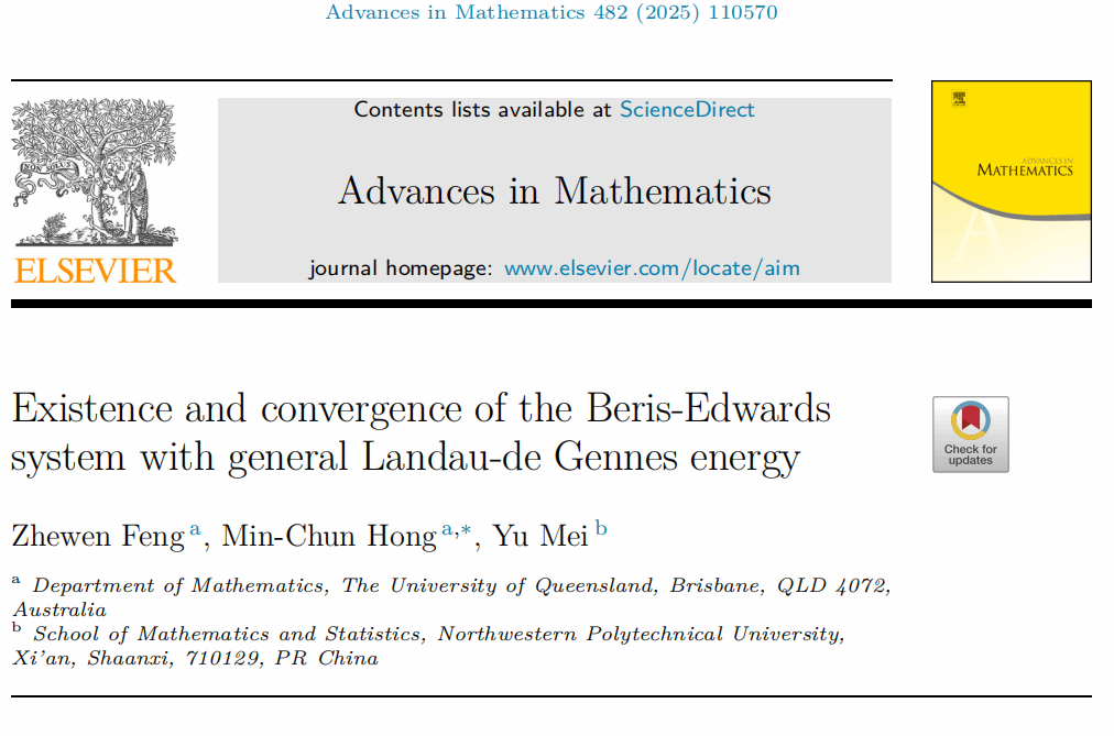 近日,韩国av 梅钰副教授与澳大利亚昆士兰大学冯哲文博士、洪敏纯教授合作,在液晶流Beris-Edwards系统强解的存在性与收敛性方面取得重要进展。研究成果形成79页论文“Existence and convergence of the Beris-Edwards system with general Landau-de Gennes energy”在数学综合期刊《Advances in Mathematics》上在线发表。按国际惯例,论文作者依姓名字母顺序排列。
