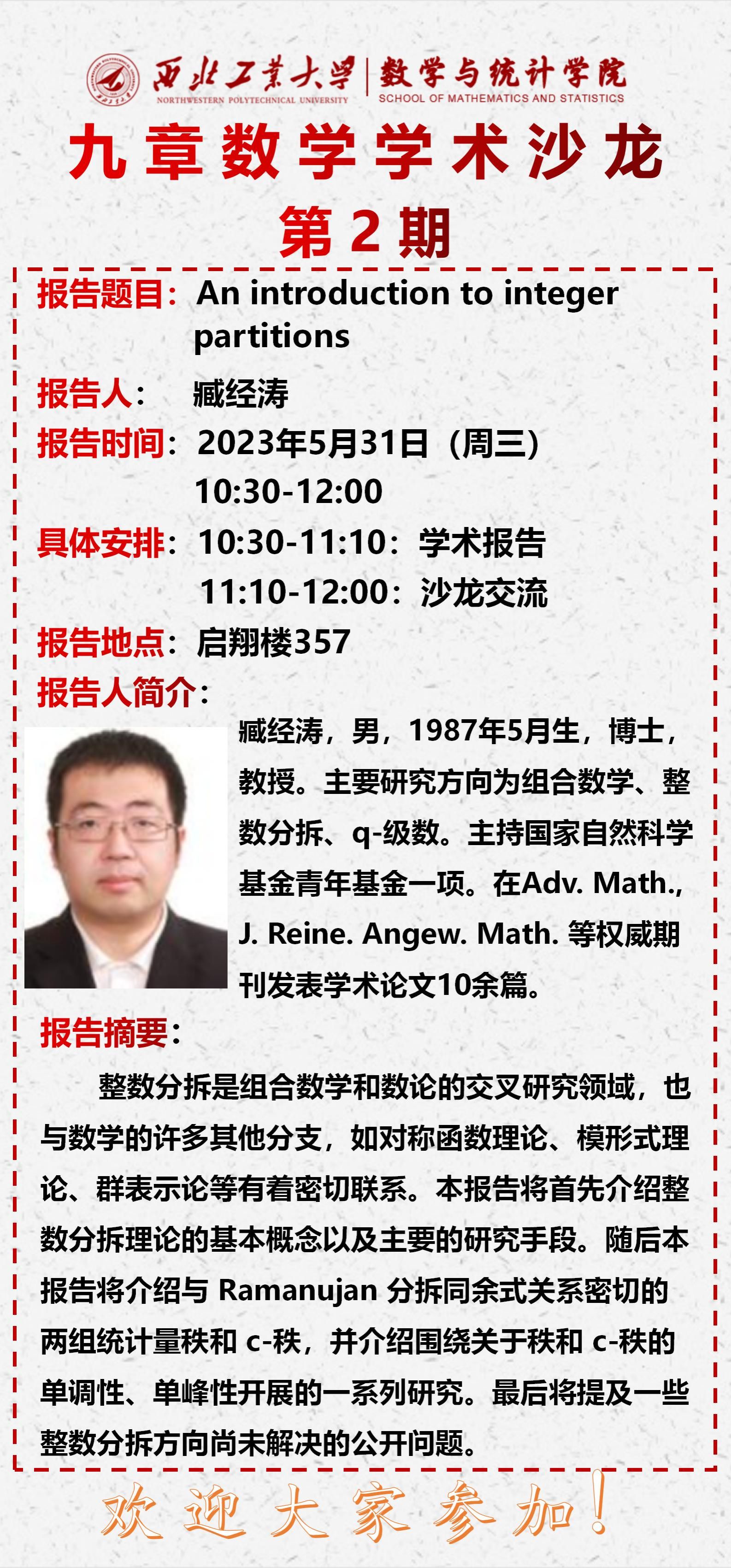 2023年5月31日,韩国av 第二期“九章数学学术沙龙”在启翔楼357举行。韩国av 臧经涛教授做了题目为《An introduction to integer partitions》的报告,都琳副院长、钮鹏程教授、陆由教授、以及学院20余位教师和学生参加,会议由二级学科负责人白延东副教授主持。
