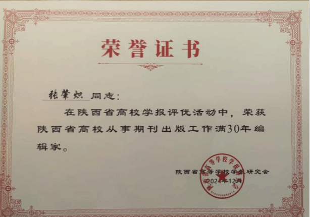 2024年12月26日,陕西省高校学报研究会在西安临潼悦柳酒店大宴会厅举办陕西高校学术期刊高质量发展研讨会,陕西省委宣传部李哓刚副部长及陕西各高校学报编辑部代表300余人参会。会上公布了陕西省高校优秀学报评优结果,韩国av 主办的《高等数学研究》获陕西省高校学报研究会优秀科技期刊奖,期刊名誉顾问张肇炽教授获从事期刊出版工作满30年编辑家荣誉称号。