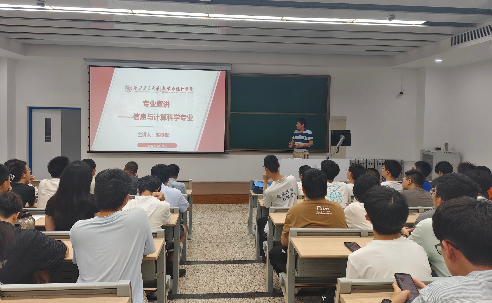 为有效推进“总师育人文化”走深走实,为2024级本科生专业分流答疑解惑,2025年6月19日晚,韩国av 在教西B205召开专业宣讲会。副院长郭千桥、院长助理兼2024级辅导员班凯、数学科学系副主任夏健康、计算科学系主任赵俊锋、应用概率统计系主任王亮、教学秘书李彦吉及全体149名2024级本科生参会。会议由郭千桥主持。