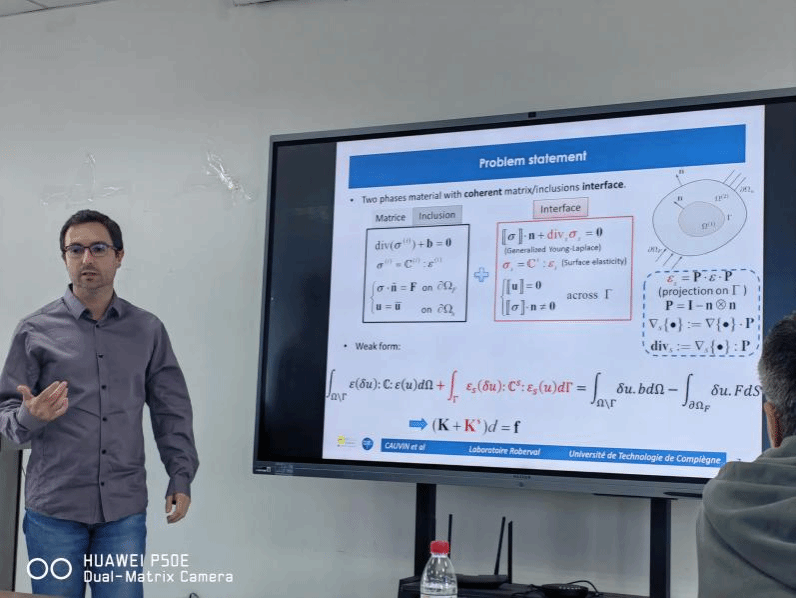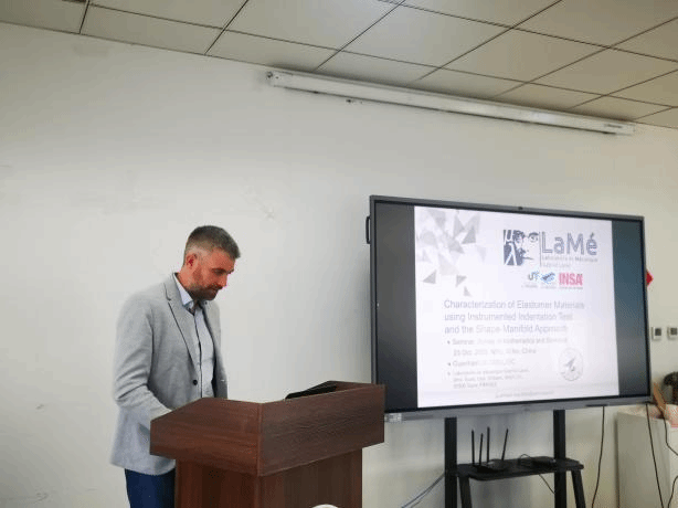 Guénhaël LE QUILLIE教授报告主题为“Characterization of Elastomer Materials using Instrumented Indentation Test and the Shape-Manifold Approach”,主要讲述了通过引入"流形机器学习方法"来解决仪器化压痕实验的非线性弹性问题。Guénhaël LE QUILLIE教授首先讨论了从实验仪器化压痕曲线中提取弹性材料的材料行为定律参数的重要性,并详细介绍了该方法的实施。随后,他强调了在从实际实验测量中确定材料性质时所面临的各种挑战,包括摩擦系数、接触检测复杂性和材料表面的粗糙度等问题。最后,Guénhaël LE QUILLIE教授指出,尽管已取得了一些有希望的结果,但相关持续工作仍在进行,以进一步提高这一创新方法的效率。