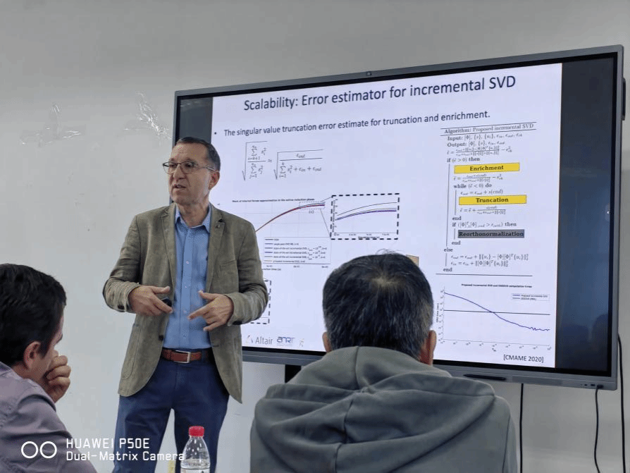 Piotr Breitkopf教授报告主题为“Introduction to Design and Analysis of Computer Experiments with Gaussian Process Regression”,主要讲述了高斯过程回归计算机实验设计与分析和计算力学中的非线性形流形机器学习方法。Piotr Breitkopf教授从缩减模型的动机讲起,以嵌入假设和光滑流形假设为切入点,通过讲述伽辽金方法、本征正交分解等理论进而讲述了一些应用实例:大规模拓扑优化、多尺度拓扑优化、瞬态动力学下的超缩减方法、SVD分解、稀疏模态选取准则,形状优化、多保真缩减模型、流固耦合问题等。最后给出了其关于流形学习的独特见解。